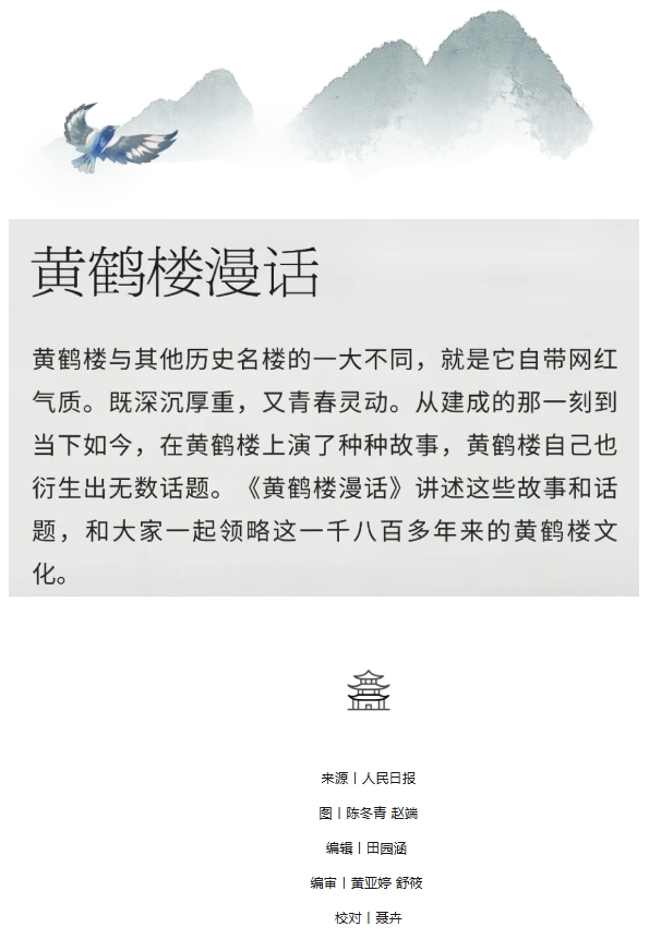 今天,《人民日报》要闻版《文化中国行》专栏特别报道“唐诗宋词里的古建筑——黄鹤楼”,一起来看。